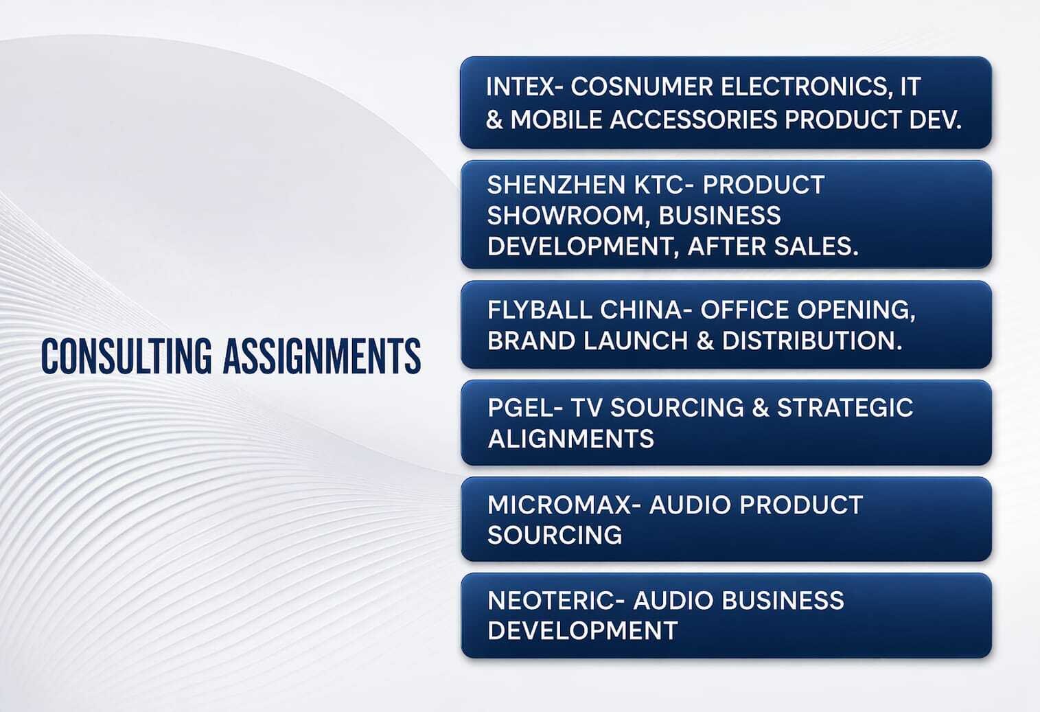 KTC India has successfully handled multiple consulting assignments across consumer electronics and IT industries, including product development, sourcing strategy, showroom setup, business development, and after-sales support. The company has partnered with leading brands such as Intex, Shenzhen KTC, and Flyball China to deliver end-to-end solutions covering product development, showroom execution, and market entry strategies.